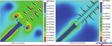 The corona ring changes the shape of the electric field, spreading it out in a sense, so that it is no longer enough to ionize the air at any time.